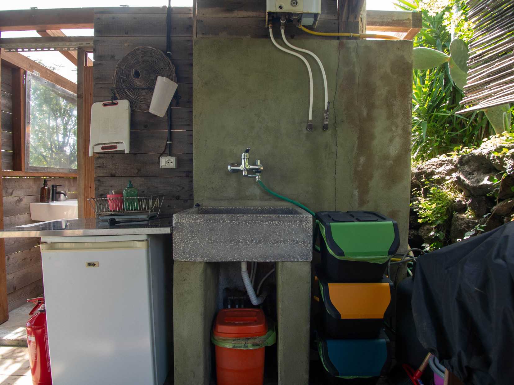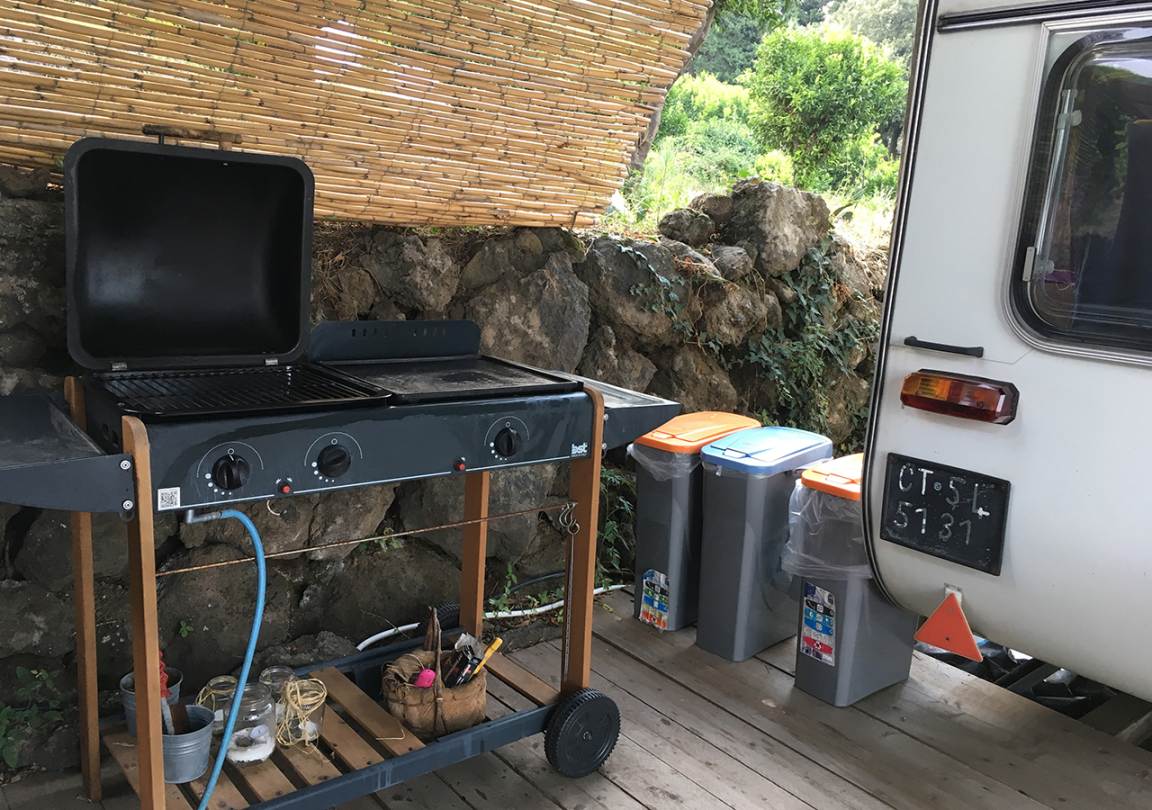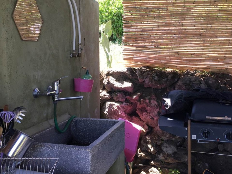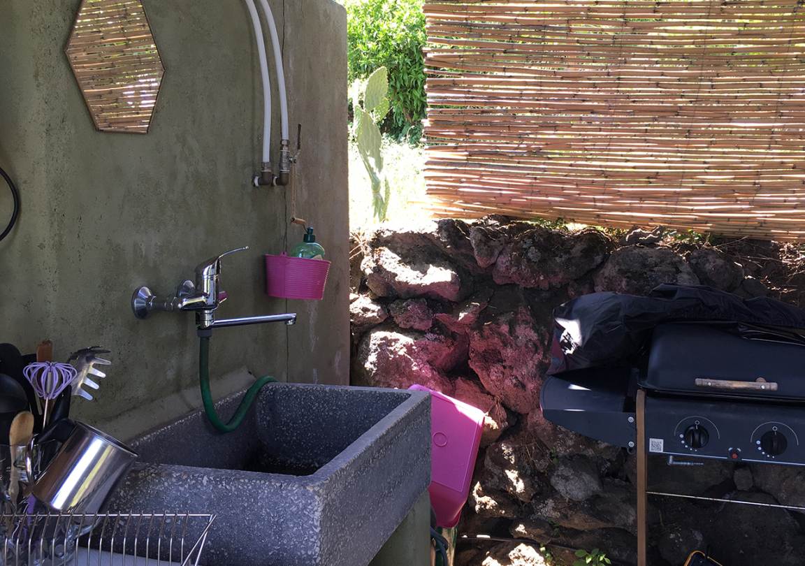 PATIO ESTERNO con cucina/barbecue, frigo, piccolo forno, moka, piatti, bicchieri, posate, pentole